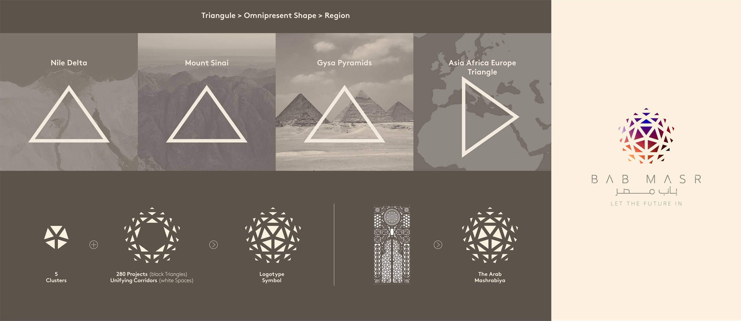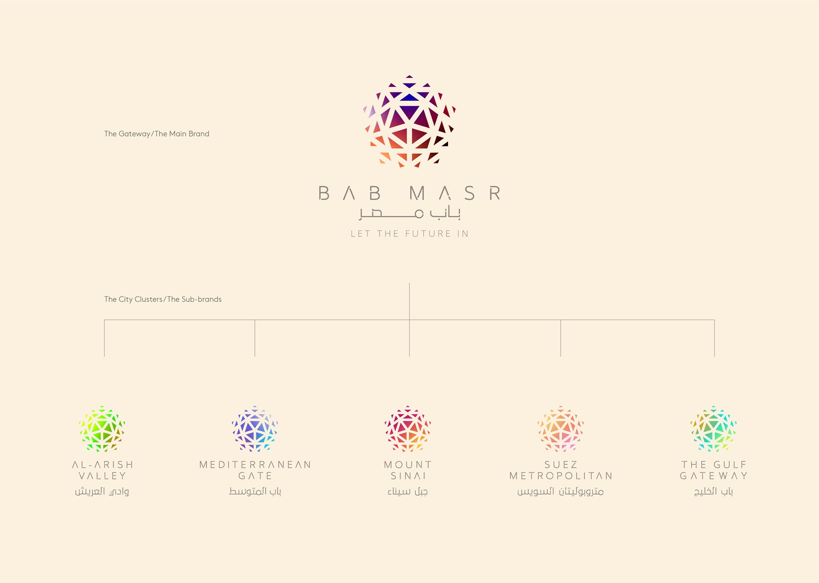 A marca tornou-se a chave para estruturar e simplificar o projeto. Foi desenvolvida uma arquitetura de marca clara: uma marca principal do projeto e cinco submarcas regionais. Um símbolo unificador — cinco elementos que se expandem em triângulos — representa a escala e a interligação das iniciativas do Bab Masr. A assinatura da marca, «Let the future in» (Deixe o futuro entrar), transmite visual e verbalmente o convite para o próximo capítulo do Egito. A narrativa equilibra a inspiração a nível nacional com clareza concreta a nível regional, tornando a visão acessível para públicos locais, regionais e globais.
