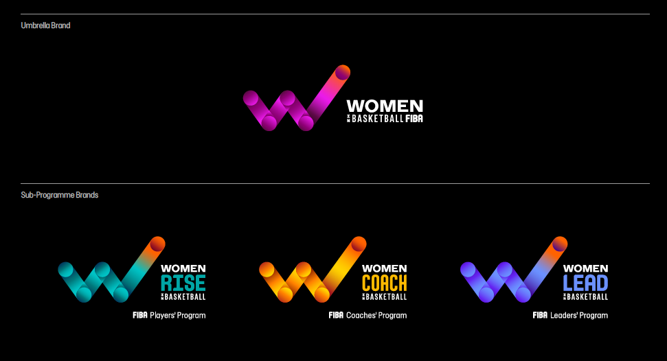 An integrated design system was developed, including logotype, color palette, typography, and imagery — ensuring global cohesion while allowing creative flexibility. The brand architecture follows a dynamic structure: Women (Verb) in Basketball, where each sub-programme gains its own verb, color, focus, and expression while remaining part of a unified collective voice.