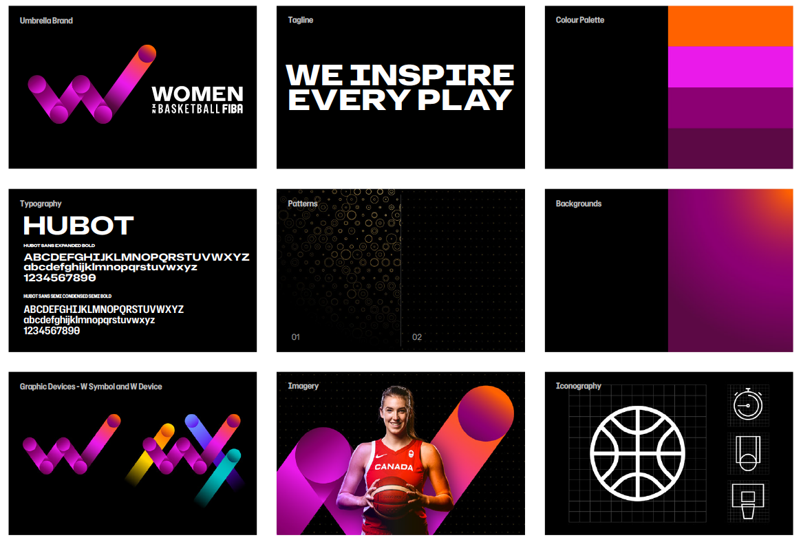 Foi desenvolvido um sistema de design integrado, incluindo logótipo, paleta de cores, tipografia e imagens — que garante coesão à escala global e permite flexibilidade criativa. A arquitetura da marca segue uma estrutura dinâmica: Mulheres (Verbo) no Basquetebol, onde cada subprograma ganha o seu próprio verbo, cor, foco e expressão, mantendo-se parte de uma voz coletiva unificada.